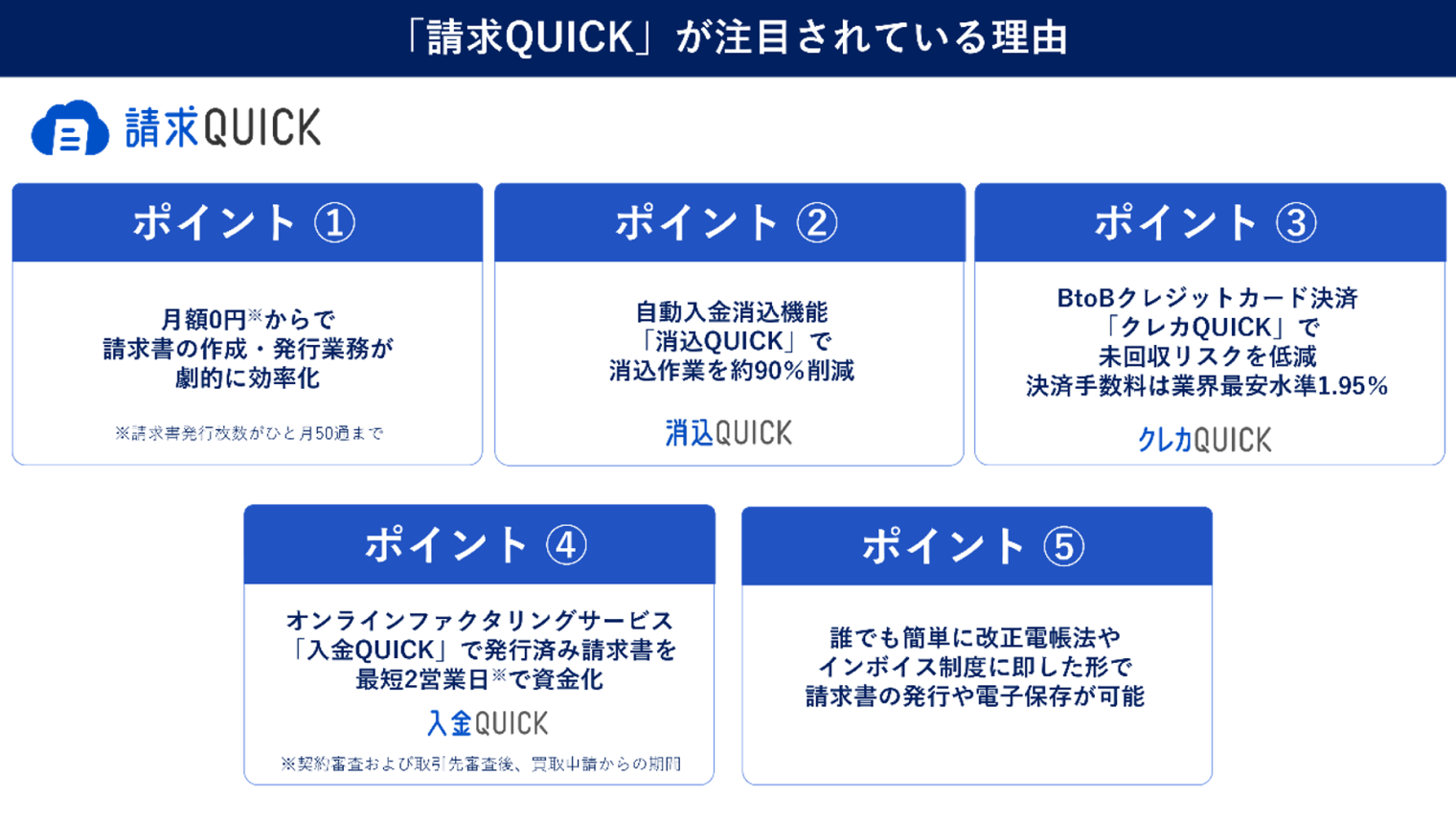 資金繰りの困りごとに対しても「入金QUICK」がついていますから、総合的に見て中小企業にとって非常に便利なツールだと思います。